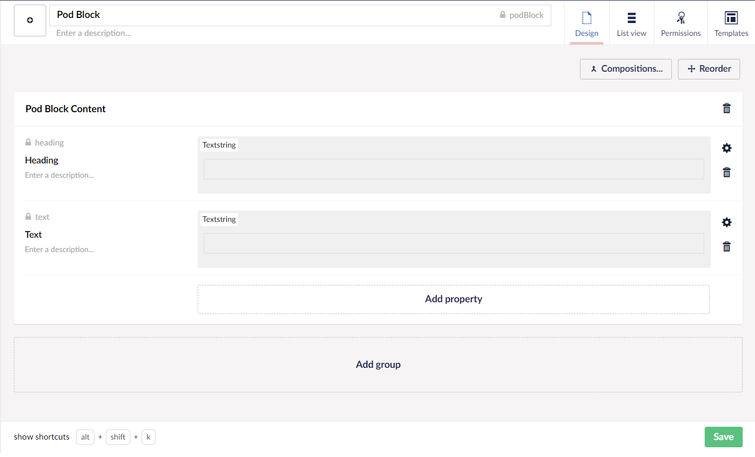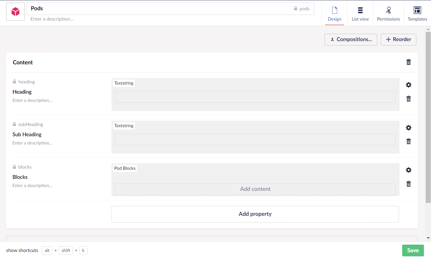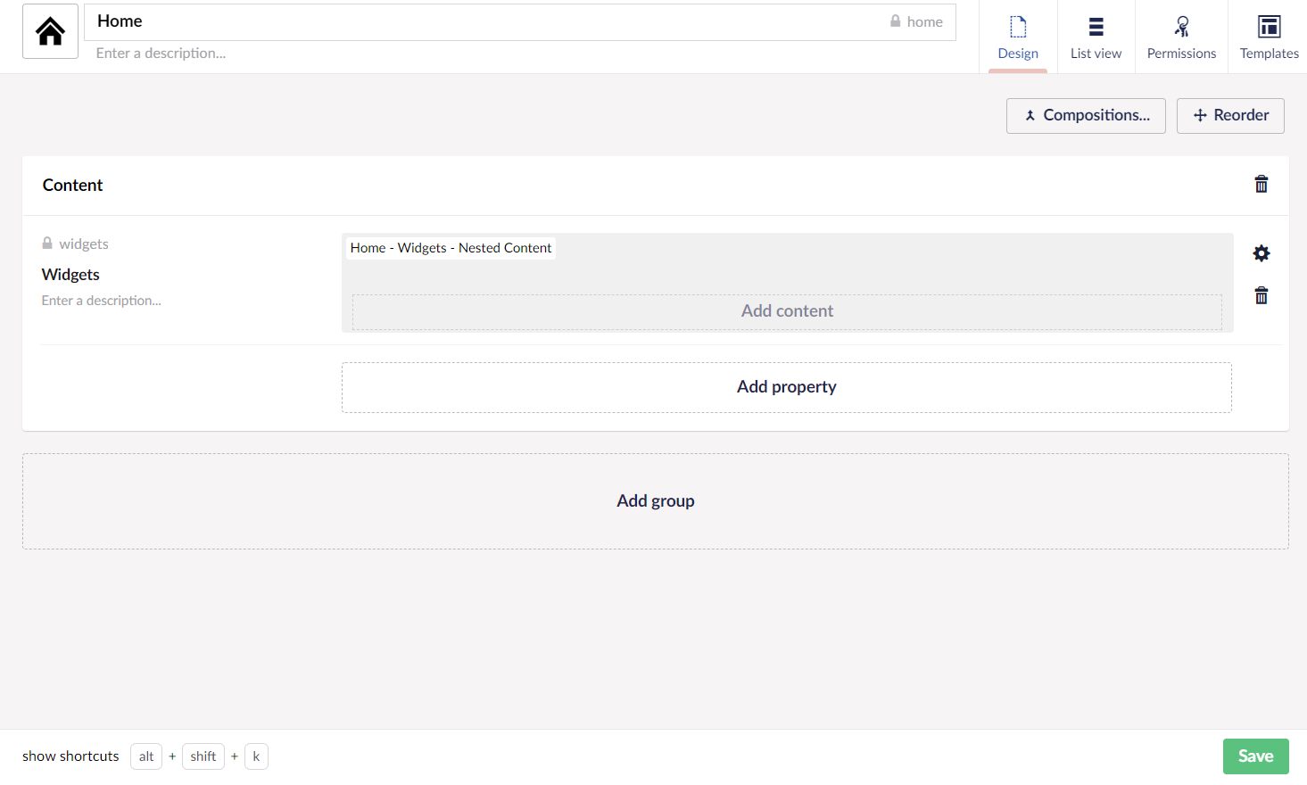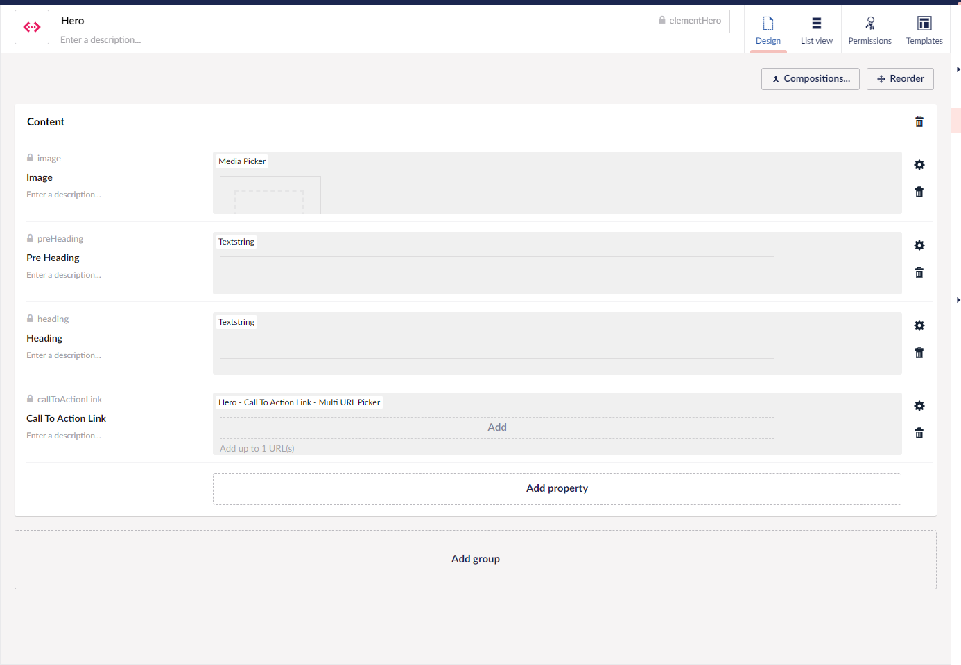 Once I am inside the backoffice of Umbraco, it is exactly what Umbraco V8 is. I can create document types and nodes based on document types. In my example, I am using Nested Content to build this page. I have named the three components on this page as Hero, Pods, and Configuration Steps. And they will be available for me to add as Widgets in my Home document type. This is how my document types look like.